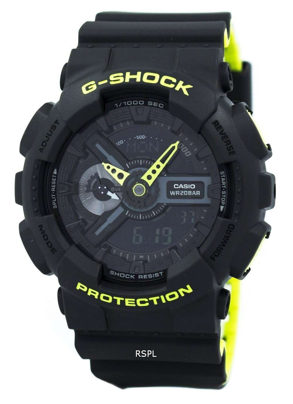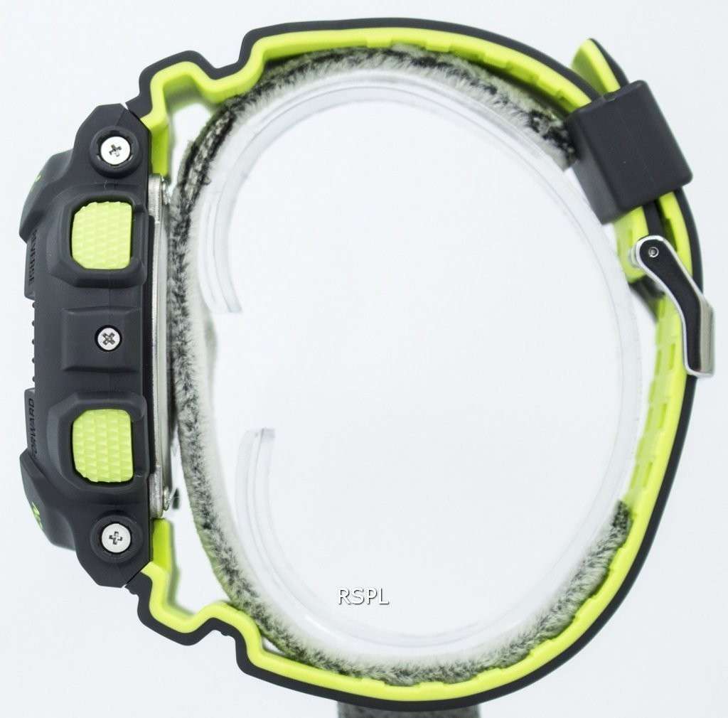 Tough and layered with neon colors, this is a big and bold sports watch in an overall matte finish, accented with neon green. It follows the color scheme of high-tech sneakers and similar other fashion items considered very high end and made possible with bi-color molding process. Pop design gets a new definition through this Casio G-Shock analog digital watch.