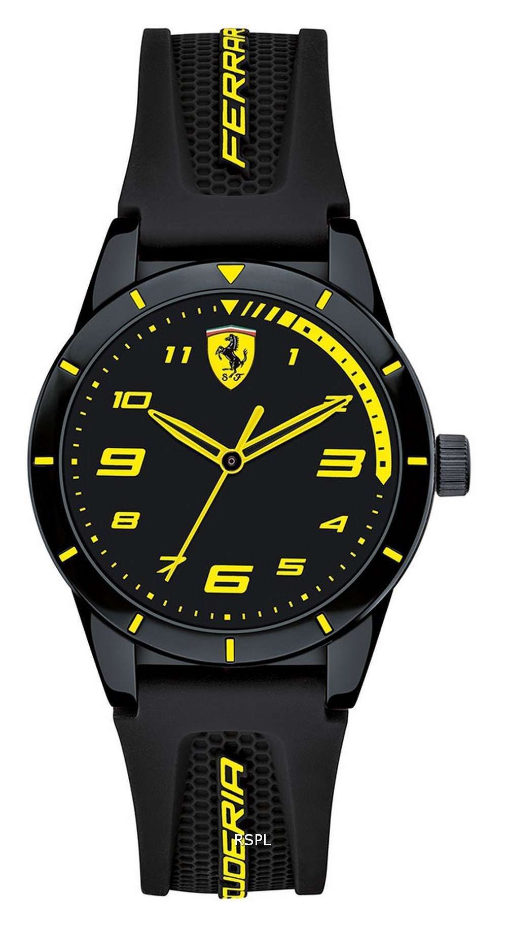 Ferrari Scuderia Redrev Black Dial Silicon Band Quartz 0860009 Kids Watch RedRev captures the thrill of the race days. Its bold new honeycomb texture is inspired by the layered structure of a race car’s monocoque chassis/body construction. The yellow and black color combination is super sharp but the watch is super light with a face size neither overly huge nor super small. A good, casual everyday wear that doesn’t demand any care.