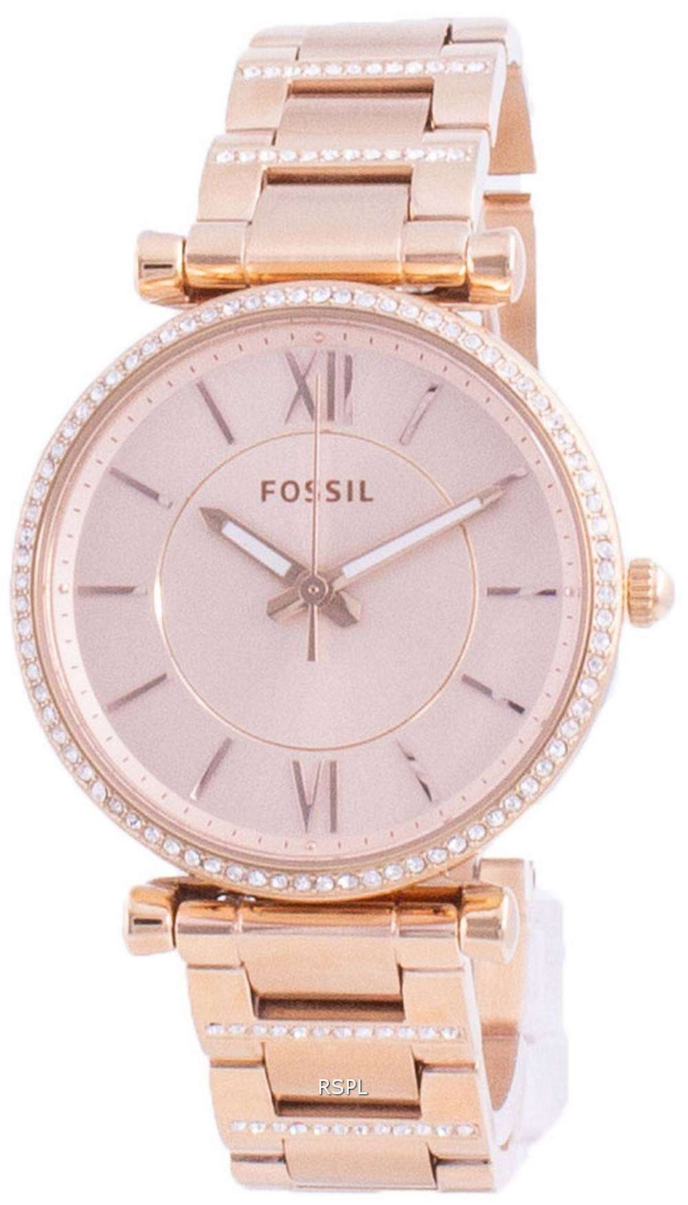 Fossil Carlie Rose Gold Tone Stainless Steel Quartz ES4301 Women’s Watch The Fossil Carlie Diamond Accents quartz watch accents your look in a way that keeps you going on your track and keeps you on trend! The diamond accents line its bezel, adding a sparkling flash of elegance to your entire look. The sleek and chic design of the watch is further enhanced by its rose gold finish and that it adds to it a modern touch doesn’t require a mention.