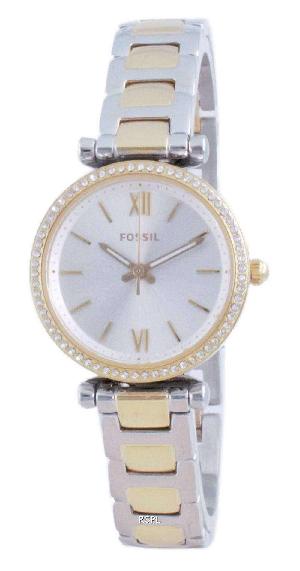 Fossil Carlie Mini Diamond Accents Quartz ES4955 Women’s Watch A watch designed to outlast any fleeting trend, this refined Fossil watch is a superlative product fit to be worn for any occasion; formal or casual. It can be easily distinguished with its stunning accents and a bright, white face bordered with yellow gold and a two-toned bracelet adorning it. Despite the delicate looks, it has a very sturdy build.