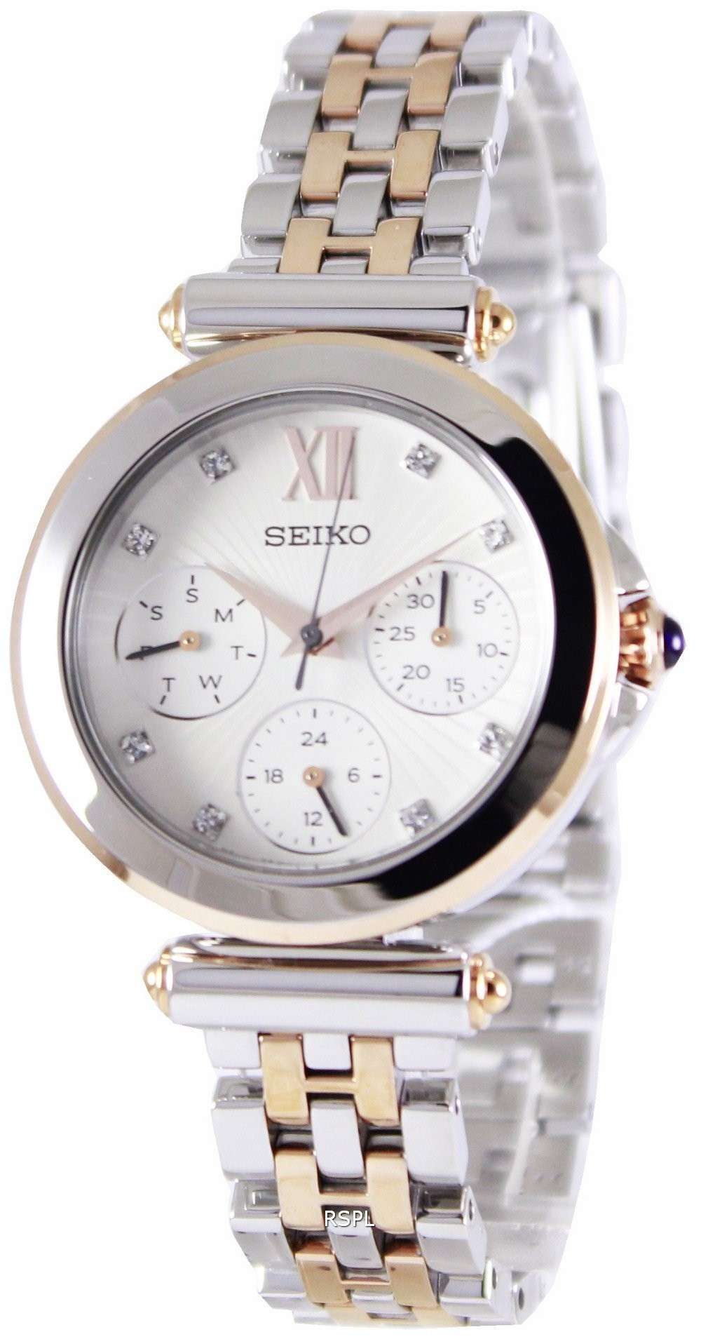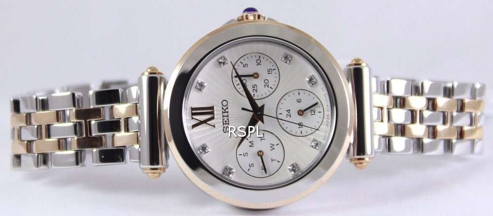 Seiko Multi-Function Two Tone Crystals SKY700 SKY700P1 SKY700P Women’s WatchLooking for a big dialled women’s watch? This one is a stunning example and suits just any mood, whether you are going out, hanging around or out for some serious business. A perfect complement to any modern wardrobe, its white dial pops up amidst any colour of clothing you’ll dress in. A watch that is perfect as an everyday wear!